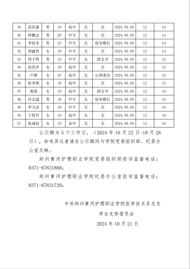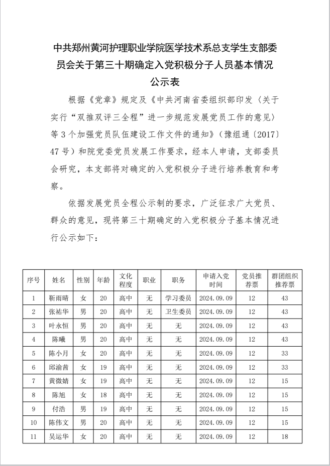 医学技术系总支学生党支部关于第30期确定入党积极分子人员基本情况公示表